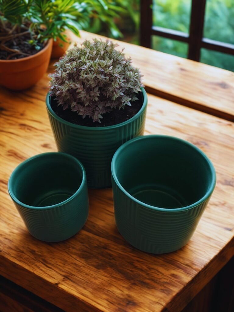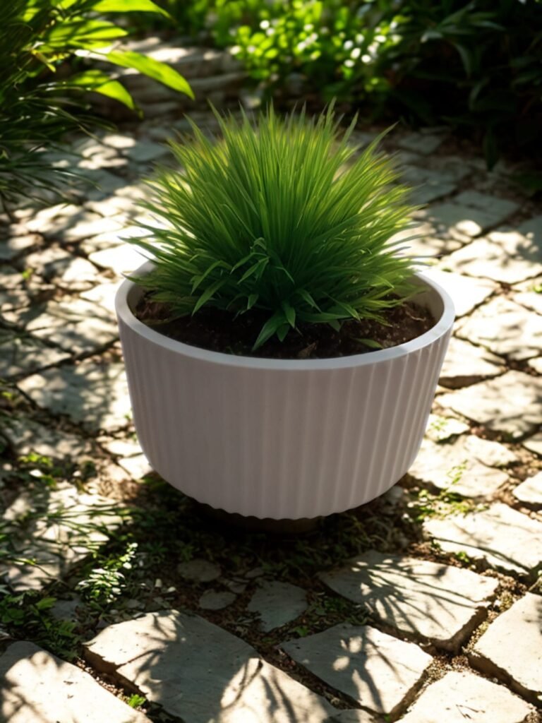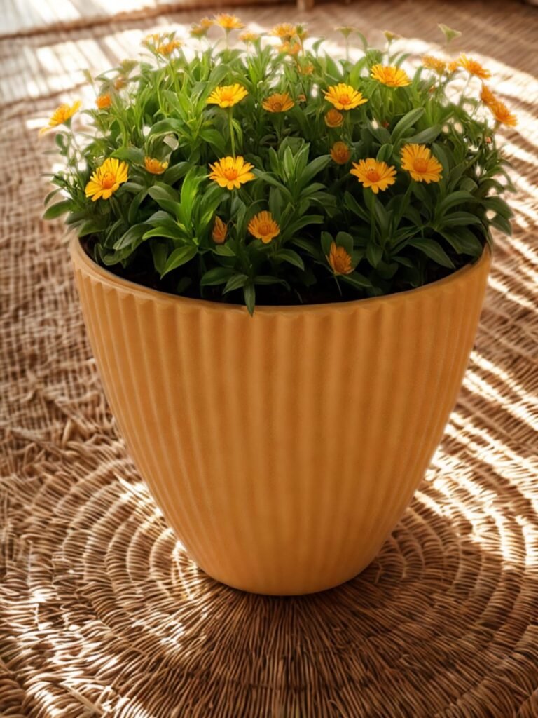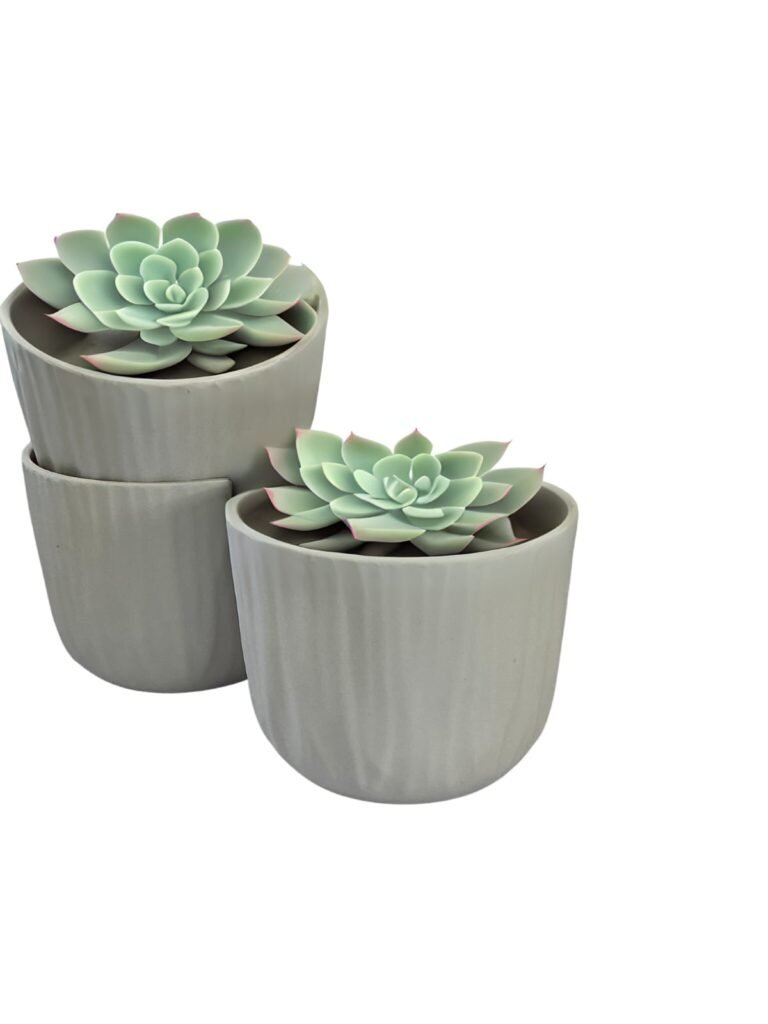 Cada macetero ha sido fabricado con materiales resistentes, ofreciendo una textura estriada única que captura la luz, dando vida a cualquier planta que decidas albergar.